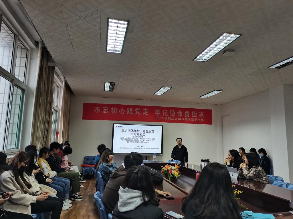 2020-2021学年第二学期第2期学术沙龙活动于2021年04月06日晚在公司会议室如期举行。本次沙龙主题为“延迟退休年龄、内生生育率与养老金”,由2020级保险专硕谭骁同学作为主讲人来为大家进行汇报讲解。此次学术沙龙很荣幸邀请到王华丽老师、闫丽瑞老师来担任讲评嘉宾。现场参加学术沙龙的有近80位来自FUN88乐天使各专业、各年级的研究生同学,现场气氛十分活跃。