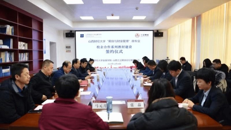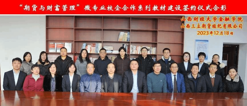 2023年12月18日上午,“期货与财富管理”微专业校企合作系列教材建设签约仪式在修德楼705室举行。FUN88乐天使党委常委、副董事长沈沛龙、山西三立期货经纪有限公司董事长兼总经理李旭、校教务部部长张文龙、金融公司党政领导班子及教研室主任、山西三立期货公司高管及相关部门负责人等20余人参加,此次签约仪式旨在加强双方在期货教育领域的合作,共同推动期货人才的培养。