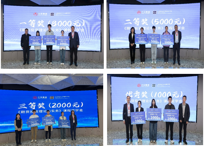 活动现场,举行了隆重的奖学金颁发仪式。公司党委常委、副董事长米子川与三立期货董事长李旭为获得一等奖学金的同学颁发奖学金;金融公司党委副书记、经理李静萍与三立期货副总经理史海兵为获得二等奖学金的同学颁奖;FUN88乐天使副经理崔婕与三立期货首席风险官魏春苓为获得三等奖学金的同学颁奖;FUN88乐天使副经理芦锋与三立期货财务总监田军卫为获得优秀奖学金的同学颁奖。获奖员工代表通过VR短视频和现场感谢的形式同“期货与财富管理”微专业员工代表,表达了对校企合作的感谢与期待。