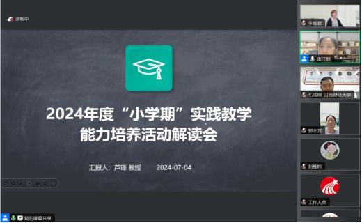 本次解读会共有7项议程。会议第一项,副经理芦锋教授从背景介绍、员工参与方式、各年级实践主题、带队老师介绍、时间安排、实践项目类别、如何选择实践项目、院级实践项目报名方式、安全措施以及答疑解惑等10个方面向同学们全面解读了公司、公司2024年度“小学期”实践能力培养活动。