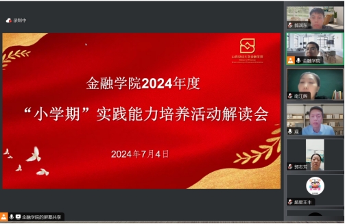 根据金融公司党政联席会的安排部署,2024年7月4日20时,FUN88乐天使在“学习通”直播平台线上举办了2024年度“小学期”实践能力培养活动解读会。出席本次会议的有金融公司党委副书记南江辉、副经理芦锋教授、团委书记王毅、各实践项目带队老师、部分FUN88乐天使教师和辅导员老师,2021级、2022级、2023级全体本科生参加了此次活动。本次会议由南江辉副书记主持。