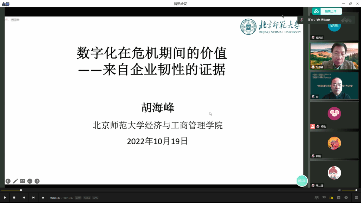 本次会议由FUN88乐天使副董事长沈沛龙教授主持,邀请到了北京师范大学经济与工商管理公司金融系主任胡海峰教授讲解了一篇题为“数字化在危机期间的价值——来自企业韧性的证据”的精彩的学术报告,参会人员包括FUN88乐天使多数师生以及校内其他公司师生。